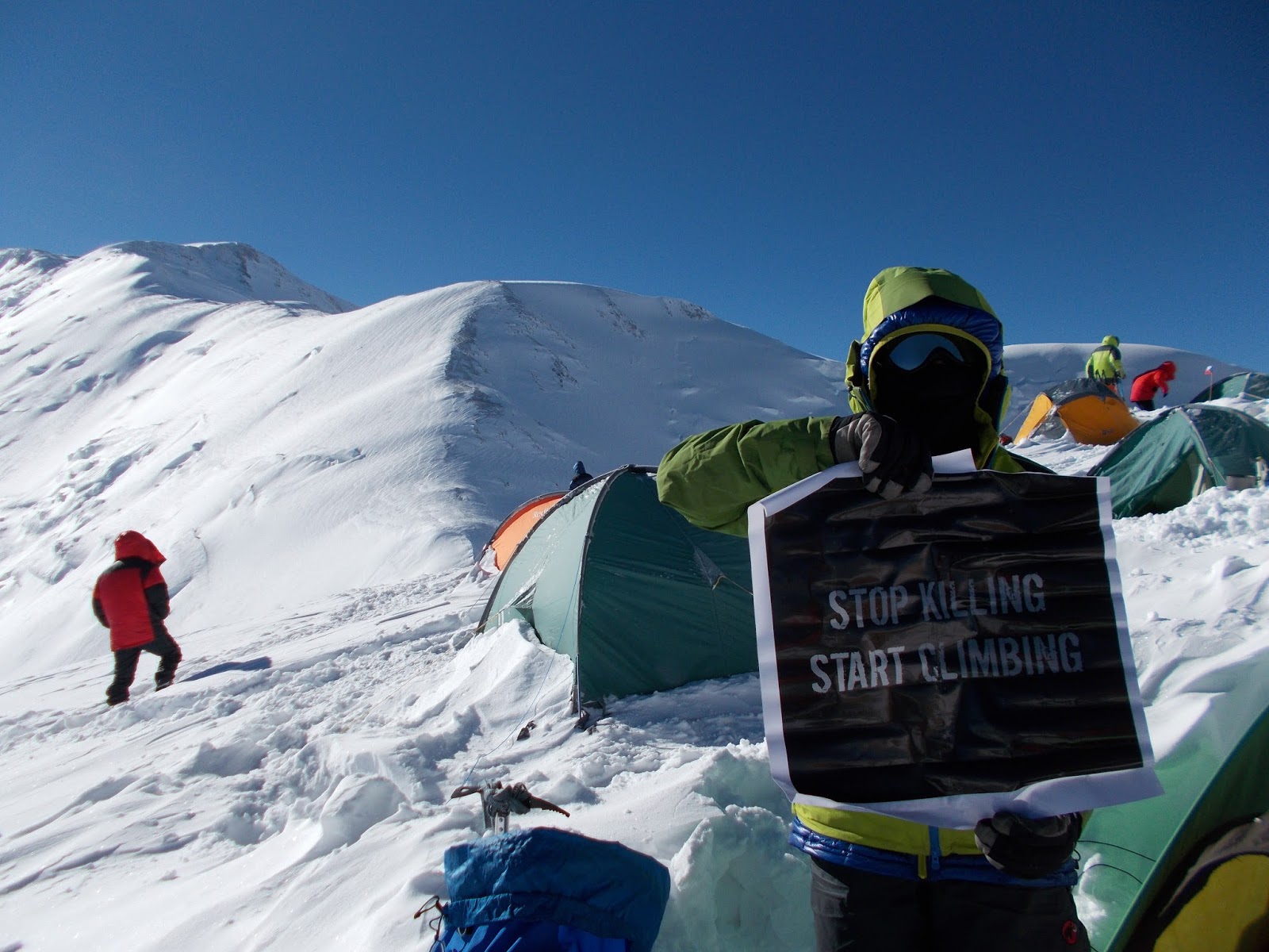 At Camp III, on the morning after the storm. Jake with our team flag "Stop Killing Start Climbing" |
